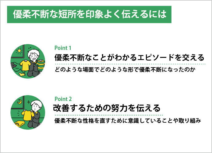 「優柔不斷」を克服するために、具体的な改善策を説明することが重要です。例えば、時間制限を設ける、情報収集の効率化、優れた決断力をもつ人のアドバイスを求めるなどの方法を挙げることができます。また、自己啓発のための本やセミナーに参加した経験も有効です。