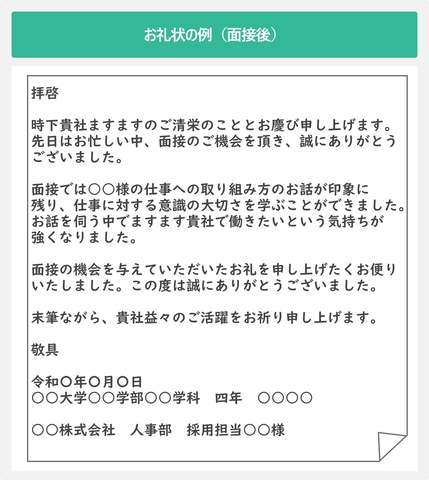 以下の例文は、面接後のお礼状の書き方を示します。縦書きの形式で記載しています。 株式会社○○○○ 人事部長 山田様 拝啓 時下ますますご清祥のこととお慶び申し上げます。平素は格別のご高配を賜り、厚く御礼申し上げます。 先日は、貴社の面接の機会を賜り、誠にありがとうございました。貴社の環境やミッションについてお話を伺い、自分のキャリアビジョンと大きく重なることを実感いたしました。また、社員の方々の熱意や専門性に触れ、貴社で働きたいという想いがより強くなりました。 面接の中で、貴社の チームワーク と イノベーション に重きを置いた企業文化についてお話を伺い、自分自身が持っている強みを活かせる場だと思い、非常に魅力的に感じました。 貴社の理念に共感し、挑戦する意欲を抱いております。少しでも貴社の成長に貢献できるよう、全力で取り組んで参ります。今後ともよろしくお願い申し上げます。 敬具 (あなたの名前) (日付)