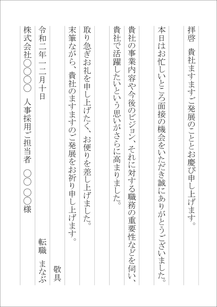 面接後のお礼状の縦書きの例文を教えていただけますか?