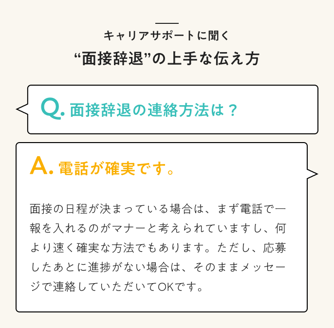 面接で辞退を伝えるときは、以下の方法をとることが適切です。
