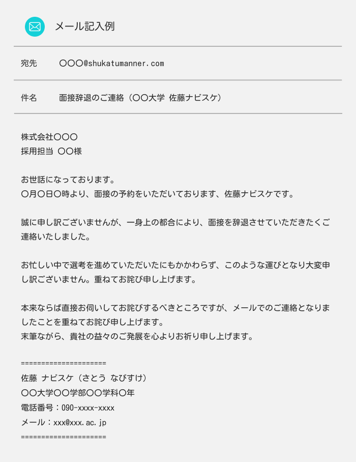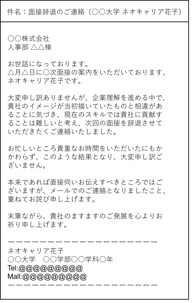 - 件名: 明確に「面接へのご招待を辞退させていただきます」というような内容を件名に含めます。