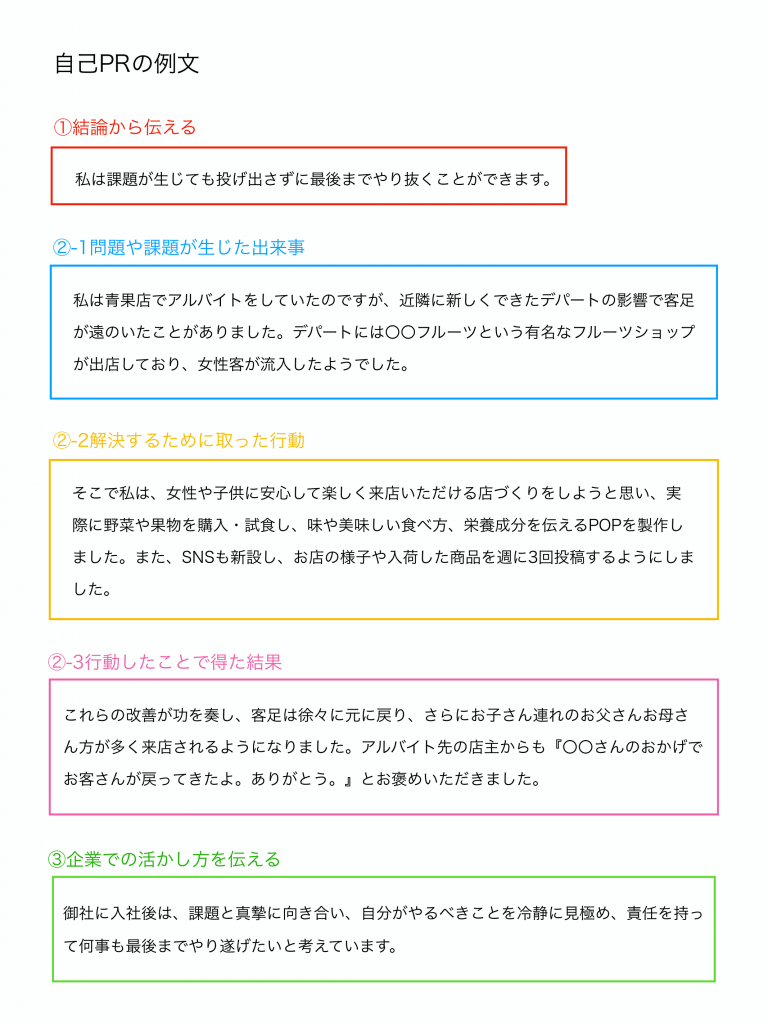 - 企業への共感の表現: 企業のミッションやビジョンに対する理解と共感を示し、自己PRを締めくくる。