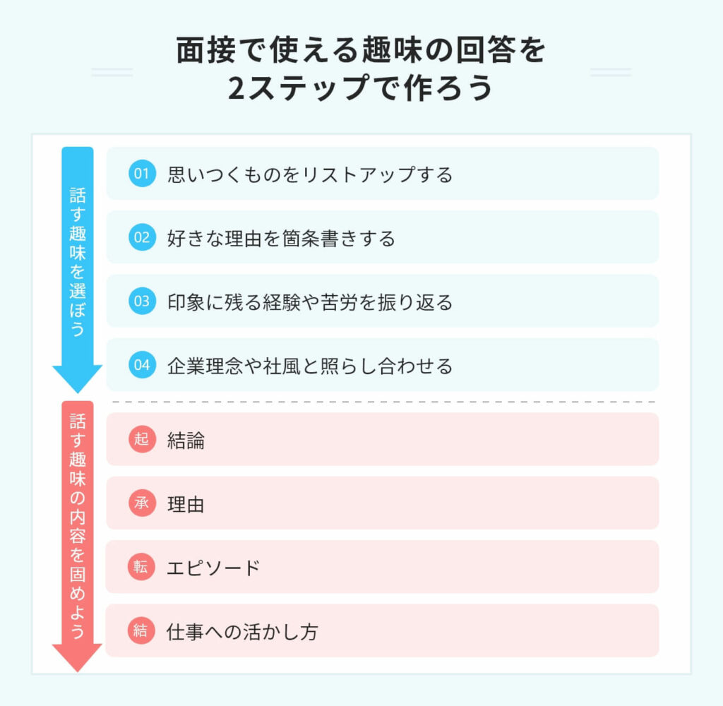 - 趣味が自分の人間性を表していると捉えて、その趣味を通じて自分がどのような人間かをアピールできるようにしましょう。例えば、料理が趣味であることを通じて、「新しいことに挑戦するのが好きで、創造力や集中力が高まる」というような自分の特徴を伝えられます。