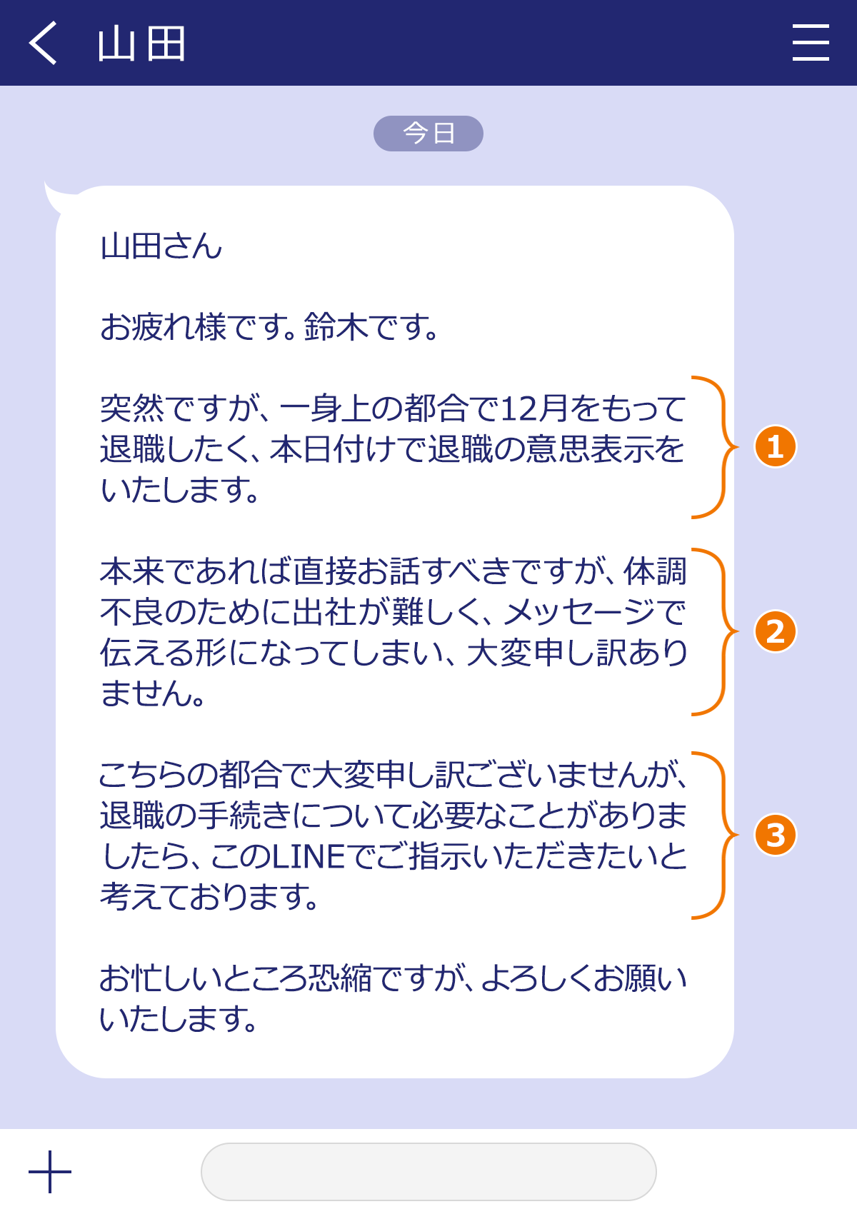 退職願のLINEの内容と形式も丁寧さと明瞭さが求められます。以下は、退職願のLINEを書く際のポイントです: