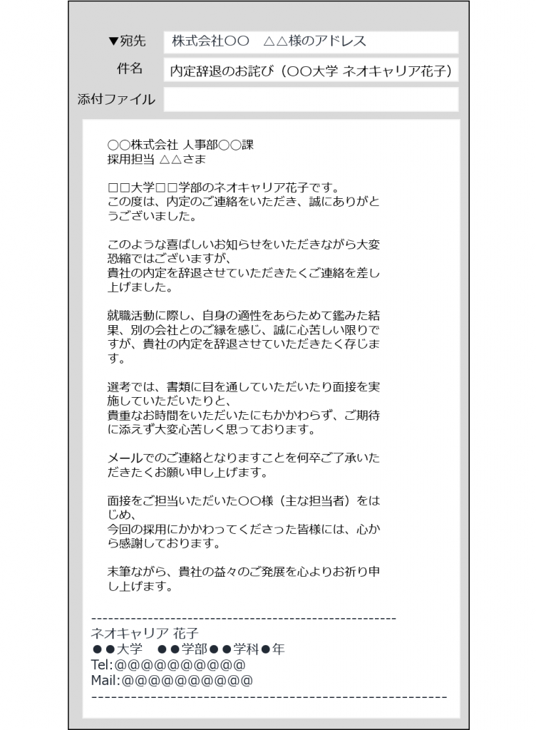 内定辞退のメールの例文は次の通りです: