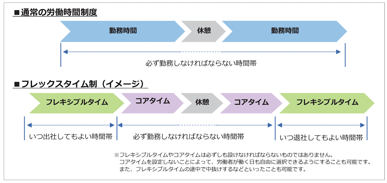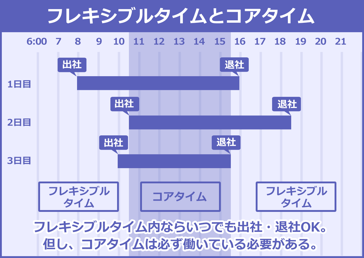 コアタイムとフレキシブルタイム | コアタイムは全従業員が必ず出社している時間帯、フレキシブルタイムは自由に調整できる時間帯 |