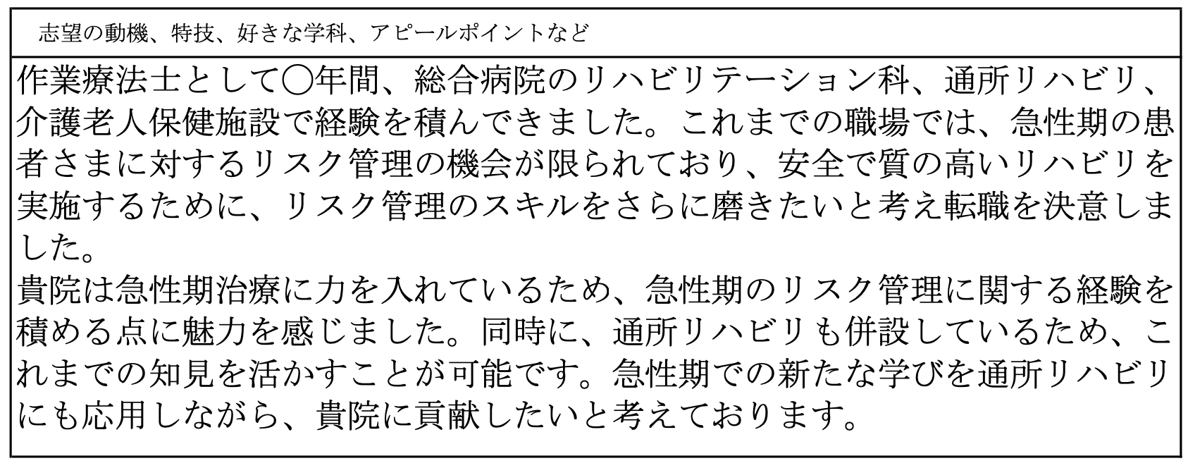 作業療法士になりたい理由は、人とのつながりを深め、彼らの生活の質を向上させたいという強い願望があるからです。この職業は、健康と福祉の分野で重要な役割を果たし、患者が日常生活を自立して送れるよう支援します。また、個々のニーズに合わせたアプローチを提供することで、患者が身体的、心理的、社会的な面でバランスの取れた生活を送れるように支援できます。作業療法士としての経験は、技術的なスキルだけでなく、人間性やコミュニケーション能力も高めることができます。