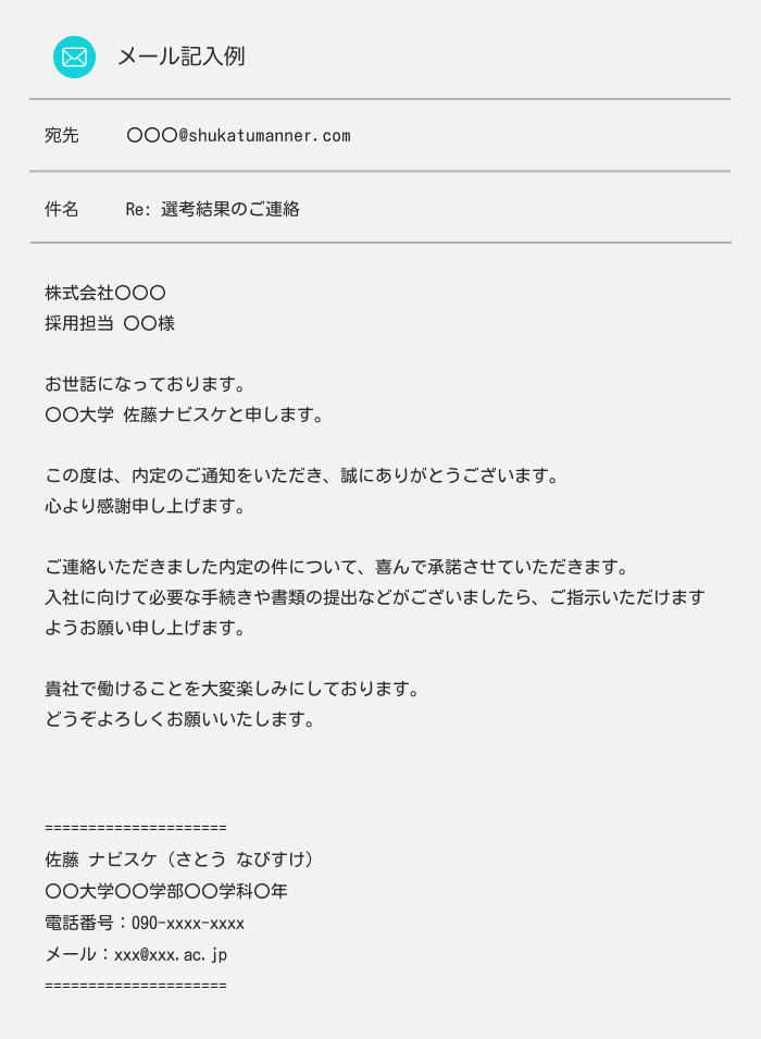 - 件名:明確かつ簡潔に「内定受け入れのご連絡」などとします。