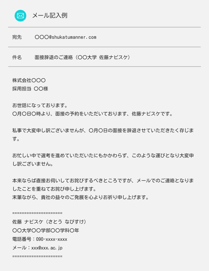 - 件名:「面接の辞退について」といった明確なタイトルを付けましょう。